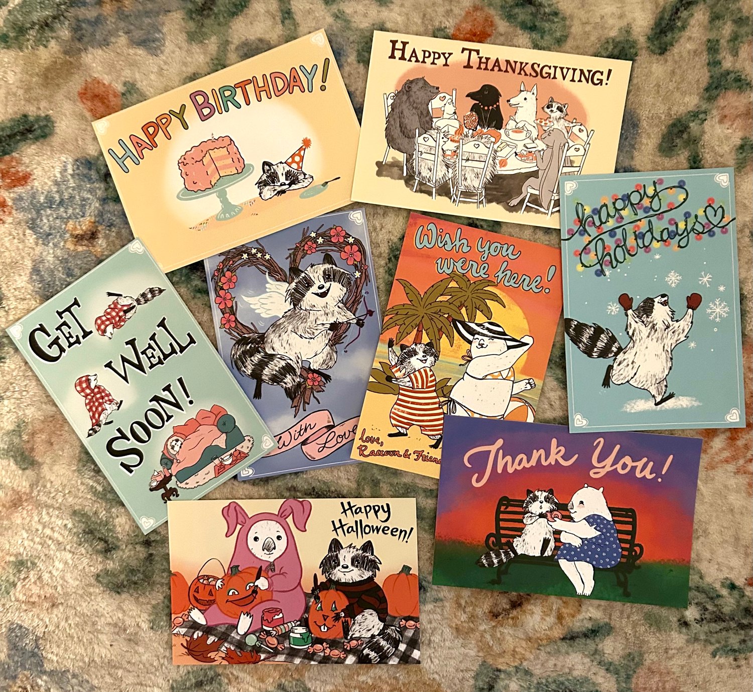 This neatly-bundled pack of eight (8) comes with one postcard of each of eight original designs from Raccoon Stories illustrator, Mashanda Lazarus: